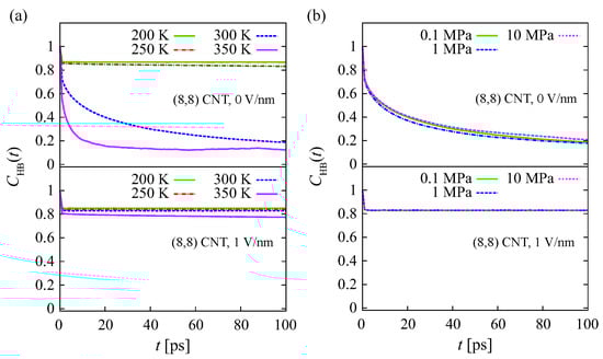 Hydrogen bond autocorrelation functions of water molecules in an CNT: (a) at various temperatures of 200 K to 350 K, constant pressure of 0.1 MPa, and under applied electric fields of 0 V/nm (top) and 1 V/nm (bottom); (b) at various pressures of 0.1 MPa to 10 MPa, constant temperature of 300 K, and under applied fields of 0 V/nm (top) and 1 V/nm (bottom).