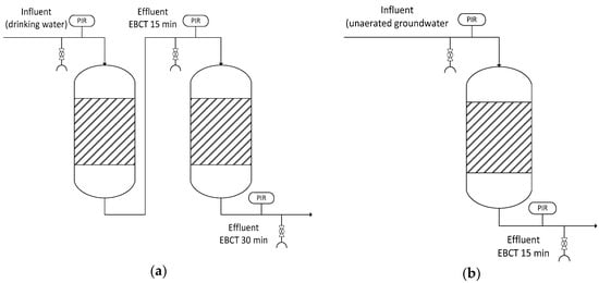 Scheme of the GAC pilot: (a) two fixed-bed adsorbers in series fed with drinking water; (b) single fixed-bed adsorber fed with un-aerated groundwater. Sampling and pressure measuring points (PIR) are indicated.