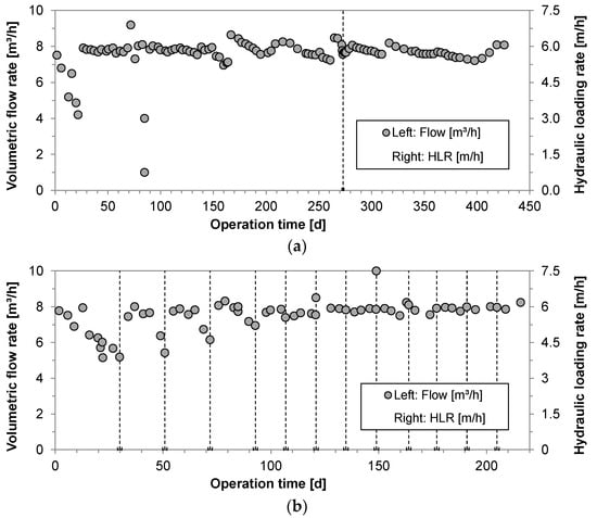 Volumetric and hydraulic loading rate (HLR) during operation of (a) two fixed-bed adsorbers in series fed with drinking water; and (b) a single fixed-bed adsorber fed with un-aerated groundwater. Backwashes are indicated by dotted lines.
