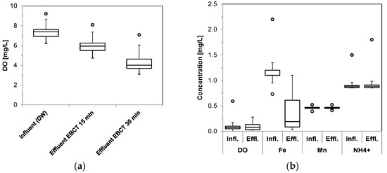 (a) Dissolved oxygen concentration in the influent and effluents of two DW-fed fixed-bed adsorbers in series (n = 49); (b) Dissolved oxygen, total iron (Fe), dissolved manganese (Mn), and ammonia (NH4+) concentration in the influent and effluent of a GW-fed fixed-bed adsorber (n = 18–53).