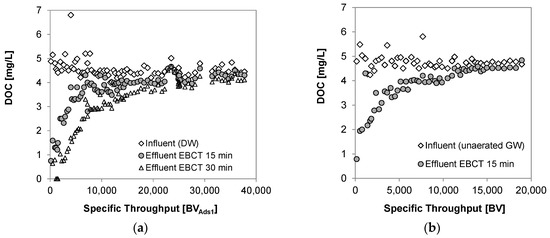 Concentrations of DOC in (a) the influent and effluents of the first and second DW-fed adsorbers vs. throughput and in (b) the influent and effluent of the GW-fed adsorber.