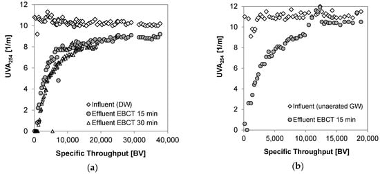 The breakthrough curves of UV absorbance at 254 nm (Figure 5) also showed an early breakthrough of UV-active bulk organic compounds with only 25% removal after 10,000 BV in the first DW-fed adsorber (15 min EBCT). However, effluent UVA254 approached the feed concentration extremely slowly after 10,000 BV. At 40,000 BV, roughly 10% of UV254 were still reduced in the first adsorber, indicating the biological transformation of UV-absorbing moieties within the bulk organics to less UV-absorbing compounds. This is underlined by the DOC breakthrough (cf. Figure 4) which approached the influent concentration at this throughput. Similar effects of preferred biodegradation of UV-absorbing compounds were shown in managed aquifer recharge systems treating groundwater from the same regional background as in the current study [15]. Another 10% concentration decrease was observed in the second adsorber, corresponding to a total EBCT of 30 min. On the other hand, breakthrough of UVA254 in the GW-fed adsorber occurred slightly earlier (15% removal after 10,000 BV) and effluent UVA254 approached the influent level quickly. This further indicated biological transformation of UV-absorbing moieties in the GAC columns under aerobic conditions.