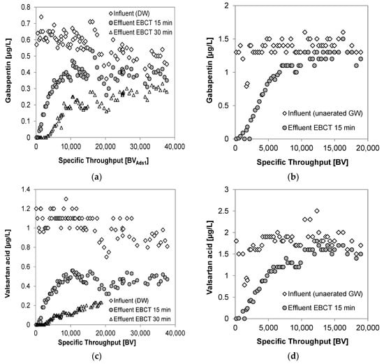 In the following, the breakthrough curves of the TOrCs gabapentin, valsartan acid, oxypurinol, and carbamazepine are discussed. The breakthrough curves for all 11 TOrCs related to throughput, as well as normalized effluent concentrations are shown in the supplementary material (Figures S2 and S3).