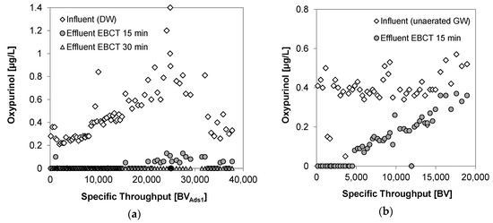 Breakthrough of carbamazepine showed similar characteristics. Although less distinctive, the carbamazepine influent concentration rose from approximately 0.13 to 0.23 µg/L and, again, decreased after about 25,000 BV. Carbamazepine is very persistent and well adsorbable [19], resulting in effluent concentrations below the limit of detection for the second adsorber (EBCT 30 min). Very similar to oxypurinol, approximately 80% carbamazepine removal occurred in the first adsorber, even after 39,000 BV. Thus, oxypurinol is readily adsorbable onto activated carbon at extents roughly comparable to carbamazepine. This finding could be of practical importance since mass-spectrometric monitoring of carbamazepine is generally less laborious: oxypurinol requires dimethyl sulfoxide for the preparation of standard solutions and most conventional HPLC columns cannot retain this substance due to its poor interaction with most C18 reversed phase columns which are commonly used for multi-residue analysis.