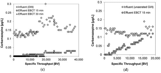 Figure 7 shows the breakthrough curves of oxypurinol and carbamazepine. The drinking water influent concentration of oxypurinol was initially about 0.3 μg/L, but rose to >1 μg/L, and then decreased after one year of operation. Even after 425 days of operation (39,000 BV), concentrations in the effluent of the second adsorber (EBCT 30 min) were below the limit of detection, and the effluent concentrations of the first adsorber were only slightly higher, ensuring >80% removal of oxypurinol at all times already after 15 min EBCT.