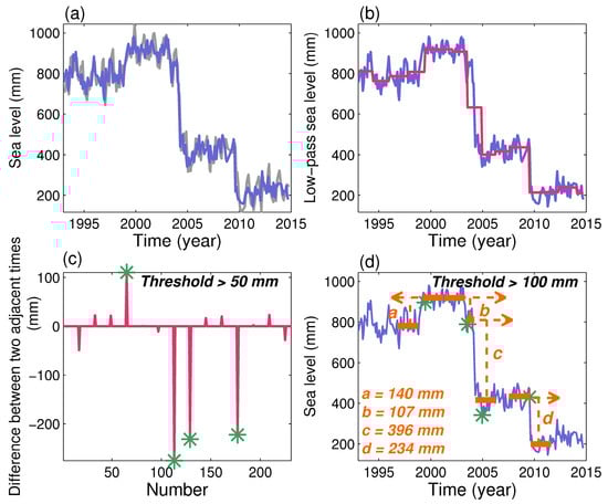 The data used for datum shift detection are the differences between two records in two consecutive time periods (from one month to the previous in each of the tide gauge time series) [33]. However, multiple jumps could appear in the differences because of strong seasonal variations (annual and semi-annual) in the sea-level induced by monsoons and thermal expansion or sporadic storm surges (e.g., typhoons). Therefore, a two-step process was applied to the tide gauge records. The first step was to remove the seasonal signals in the monthly tide gauge time series through a six-parameter regression analysis (bias, trend, annual, and semi-annual terms) as depicted in Figure 2a (purple curve). The second step was to analyze the non-seasonal variations of the tide gauge data through the multiresolution analysis method [34,35]. Multiresolution analysis based on wavelet theory aims to remove high-frequency signals from the monthly tide gauge data. The multiresolution analysis method includes two important parameters, namely, wavelet functions, , and scaling functions, which are used to find the signal details and approximations, respectively. We represent the tide gauge records, f, as an orthogonal series with and