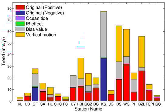 To illustrate the contributions of each geophysical and datum correction to sea-level variations around Taiwan, the absolute value of trend differences after the different corrections was calculated and is presented in Figure 3. The ocean tides change the sea-level trends in the range of 0–0.9 mm/yr, with a mean of 0.2 mm/yr, and the effect of the IB change ranges from 0.1 to 0.6 mm/yr, with a mean of 0.3 mm/yr. The results indicate that ocean tides and IB have a slight impact on sea-level trends around Taiwan, as determined by the tide gauges, constituting approximately 9% and 14% of the observed trend, respectively. The datum shift has a significant impact on sea-level trends as derived from the tide gauges at 0.4–39.5 mm/yr, with an average trend of 7.3 mm/yr; the vertical land motions contribute to the regional sea-level trends in the study area with a range of 0.4–31.0 mm/yr, with an average trend of 8.0 mm/yr (Figure 3). These values are significantly larger than the global mean sea-level rise of 3.2 ± 0.1 mm/yr [1] derived from satellite altimetry for 1993–2012, thereby indicating that they have to be considered when calculating absolute sea-level trends around Taiwan from tide gauge data.