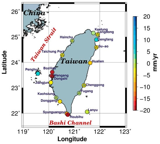 Vertical motion correction is crucial in the Taiwan region because vertical motions along the southwestern and northeastern coasts of Taiwan are larger than sea-level trends [13]. The results of the estimated vertical motions for each station are illustrated in Figure 4. The results are geographically nonuniform. In the eastern area of Taiwan, the estimated vertical land motion trends indicate a range of −6.2–4.2 mm/yr; the maximum subsidence trend of 6.2 mm/yr is from the Hualien tide gauge data, where subsidence was observed at 10 mm/yr relative to Hualien City, using the space-borne synthetic aperture radar interferometry method for 2004–2008 [41]. The discrepancy between our result and the result from a previous study [41] may be caused by the observations covering different time periods. Significant subsidence was observed at the tide gauges in the western area of Taiwan, especially in the southwestern area of the Boziliao, Dongshi, and Wengang tide gauge sites, with rates of 23.5–31.0 mm/yr (Figure 4; see Supplementary Material for details about the Dongshi tide gauge records). This strong subsidence was also confirmed by GPS observations around Taiwan [13]. The southwestern plains of Taiwan are highly developed agricultural and fishery areas. Thus, land surface elevation falls gradually because of groundwater pumping in the southwestern plains [13,42].