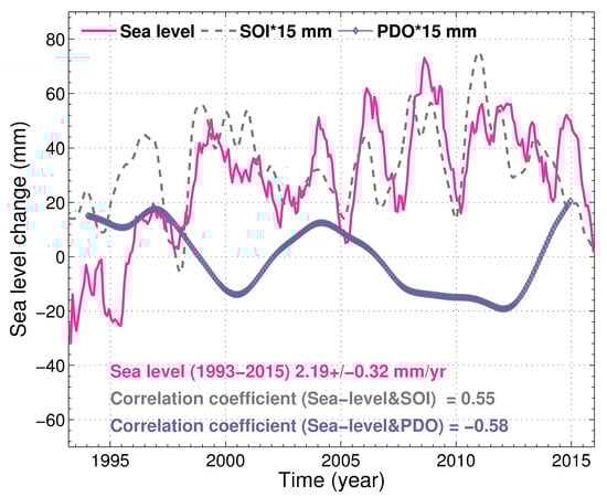 Sea-level changes around Taiwan derived from the satellite altimetric data covering the time span from 1993 to 2015. The seasonal signals have been removed, and an 11-month smoothing applied to the altimetric data. The gray dashes and purple diamond curves denote the low-pass southern oscillation index (SOI) and Pacific decadal oscillation (PDO), respectively, using 11-month and five-year smoothing, respectively. The correlation coefficients were calculated by the Pearson method, and the p-value is <0.05.