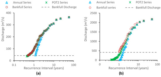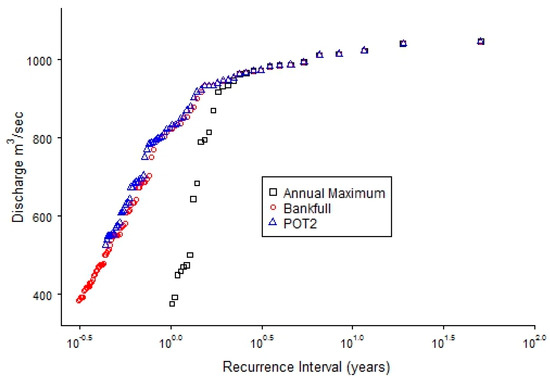 A total of five flood indicators based on the AM, POT and BF series were selected to estimate frequency of small magnitude floods and to compare frequency estimates between flood series (Table 1). This approach is consistent with previous studies (e.g., [13,17,30]). While AM and POT indicators are commonly used for flood frequency, BF discharge is specific to this study and is introduced to construct actual flood series.