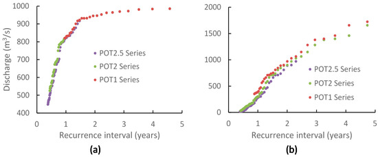 Comparison of flood magnitude under a given recurrence interval for three POT series for (a) a wet tropical catchment (Site ID 113) and (b) a dry tropical catchment (Site ID 119).