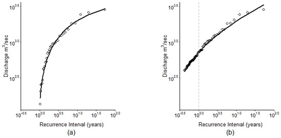 Flood frequency estimates are of prime importance in many water resource planning and management projects such as design of infrastructure, flood insurance studies, floodplain management and ecological studies [1,2]. In the past, research on flood frequency has focused on the estimation of extreme flood events because of their large and often dramatic impacts on society and visible economic costs. Conversely, the importance of frequent, low-magnitude floods is often overlooked. For example, despite their high erosive power, large floods transport a relatively small proportion of total sediment loads to the marine environment because they occur less frequently. In many catchments, floods occurring on average once a year account for 50% of total sediment loads [3]. While large floods are usually responsible for channel avulsions, levee breaches, and transporting large bed-load sediments, frequent floods (e.g., recurrence interval of one or two years) are primarily responsible for controlling channel morphology because of their frequent nature and ability to erode and transport large volumes of fine sediment. Frequent floods are especially important for riparian and aquatic biodiversity [4,5,6,7,8]. Frequent, low-magnitude floods also indirectly shape communities by acting as a disturbance agent by altering nutrient distribution, rearranging sediment and removing individual organisms, creating patchiness that fosters biodiversity [9]. Furthermore, comparatively frequent floods that overtop channel banks provide a connection between the river and its floodplain, exchanging nutrients, organisms, and sediment [4,10,11]. Recognising the geomorphic and ecological importance of high-frequency floods, river restoration practitioners have identified floods with recurrence intervals typically in the range of one to two years as an important consideration in channel design criteria [12]. Given the significance of high-frequency floods for channel morphology, ecology, and restoration, changes in flood regimes will have important implications for channel process, function, and management.