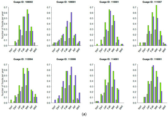 Selection of a flood series influences the frequency of floods between months. Results show that both the AM and POT series differ from the actual monthly flood frequency (Figure 10). As the AM series excludes many historical floods, it reduces the frequencies at which a flood is designated to occur within months. The partial series overestimates frequencies compared to the BF series at a monthly timestep if a small threshold is used and underestimates monthly frequencies if a large threshold is used. We noticed that the impact of the flood series is different between catchments. For the wet tropical catchments, where floods are frequent, the AM series underestimates the flood frequencies between months. While the partial series better predicts the monthly floods for the wet tropical catchments, it overestimates flood frequency for dry tropical catchments where floods are less frequent.