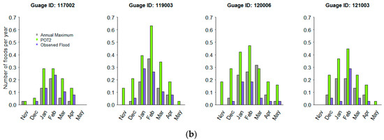 Monthly flood frequency for the AM and POT series compared to the BF series for (a) wet-tropical and (b) dry-tropical catchments.