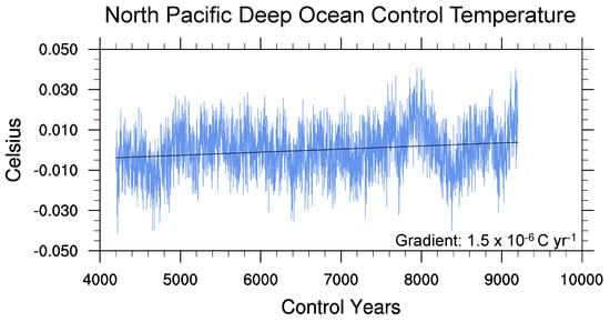 The experiment used in this study was designed to sample internal variability in the model-coupled Earth system, including the deep ocean [23]. First, we spun up a fully coupled control simulation with constant pre-industrial radiative forcing. Beginning at the year 4200, after the deep ocean had reached approximate dynamic equilibrium, historical simulations with transient natural and anthropogenic forcings were initialized from unique snapshots of the fully coupled model state sampled every 100 years from the control simulation, ending with 50 ensemble members. The transient simulations are extended to 2100 using the representative concentration pathway (RCP) 8.5, an idealized future scenario in which anthropogenic radiative forcing increases to roughly 8.5 W m−2 by 2100 [45]. Allowing the ocean to reach approximate dynamic equilibrium prior to initializing the climate change ensemble prevents any model ocean drift from affecting our estimates of sea-level variability. Even after ~4000 years of equilibration, the model exhibits small drift in the deep ocean and internal variability across a variety of timescales (interannual to centennial). As a simple illustration, Figure 1 displays the timeseries of ocean temperature in the pre-industrial control simulation at a depth of 2000 m in the North Pacific (Latitude: 57° N, Longitude: 180° W) over the period which our 50-member ensemble runs are initialized (equilibration year 4200–9100). The North Pacific deep ocean contains some of the oldest waters on the planet, as this area has little deep-water formation or upwelling. Even after the ~4000-year spin up, we still see a small trend in ocean temperature in the presence of relatively large internal variability, during the next 5000 years (model year 4000–9000).