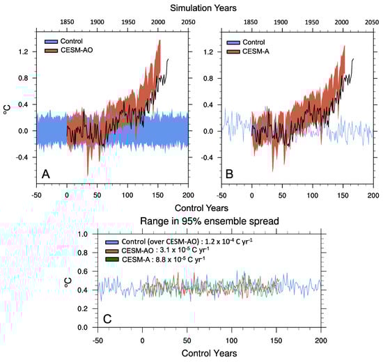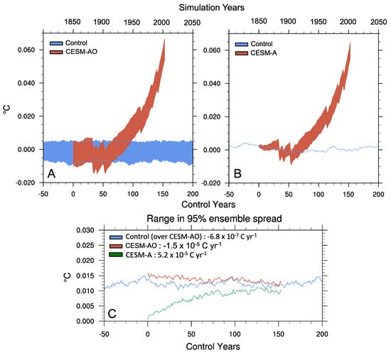Globally averaged atmospheric surface temperature for CESM-AO (A) and CESM-A (B). See text for description of differences between ensembles. Blue lines (A,B) display timeseries of atmospheric temperature pre-industrial control simulation. Red lines display historically forced simulations. The 95% range in ensemble spread is shown in (A) and (B). Black lines are observed globally average temperature from the HadCRUT4 dataset [48]. Timeseries of the 95% range are shown in (C). Values are the linear trend in ensemble spread over the period shown from 0–150 years.
