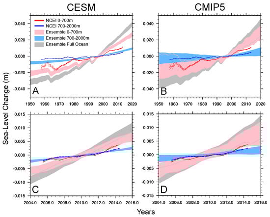 We show observational estimates as a reference for ensemble comparisons [40,41], keeping in mind the inherent uncertainties and limitations in both the model and observations. Pentadal observations are used from 1957–2013, and yearly observations are used from 2005–2015 from NCEI. All panels display the 95% range of each ensemble. Both the CESM and CMIP5 ensembles exhibit larger mean sea-level rise in the upper ocean compared to NCEI, which may be an artefact of several different types of biases in both models and observations. Model biases in CESM are discussed in the previous section with issues relating to the low-resolution version used. Discrepancies in the higher-resolution models that make up the CMIP5 ensemble may be due to multiple reasons, but the warm biases seen here in the ensemble may be due to a lack of interactive aerosols in some of the models included in the ensemble [21,47]. As a simple test to characterize the effect of aerosols on steric sea-level rise, we calculated trends in the CMIP5 models included in this study with and without interactive aerosols (those with interactive aerosols are highlighted in bold in Appendix A) and compared these to the trends of those that did not. Table 1 shows how the mean ensemble sea-level trends decrease when considering only models with interactive aerosols, but that this effect is only pronounced on multi-decadal timescales. Additionally, the observations themselves may not represent true sea-level change, as ocean coverage is poor throughout the subsurface ocean and observations are biased towards the Northern Hemisphere, as coverage in the South is far less extensive [6,7,8,9,10,11,12,13].