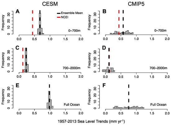 Histograms of model ensemble steric trends over different depth for the multi-decadal period (1957–2013). Full ocean is defined as the entire available depth of each model ocean. Red dashed lines are observations from the National Center for Environmental Information (NCEI), and black dashed lines are the model ensemble means. (A): CESM, 0–700 m; (B): CMIP5, 0–700 m; (C): CESM, 700–2000 m; (D): CMIP5, 700–2000 m; (E): CESM, Full ocean; (F): CMIP5, Full ocean.