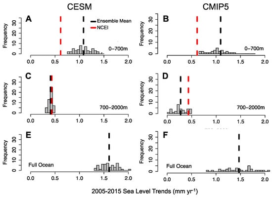 Histograms of model ensemble steric trends over different depths for the decadal period (2005–2015). Full ocean is defined as the entire available depth of each model ocean. Red dashed lines are observations from NCEI, and black dashed lines are the model ensemble means. (A): CESM, 0–700 m; (B): CMIP5, 0–700 m; (C): CESM, 700–2000 m; (D): CMIP5, 700–2000 m; (E): CESM, Full ocean; (F): CMIP5, Full ocean.