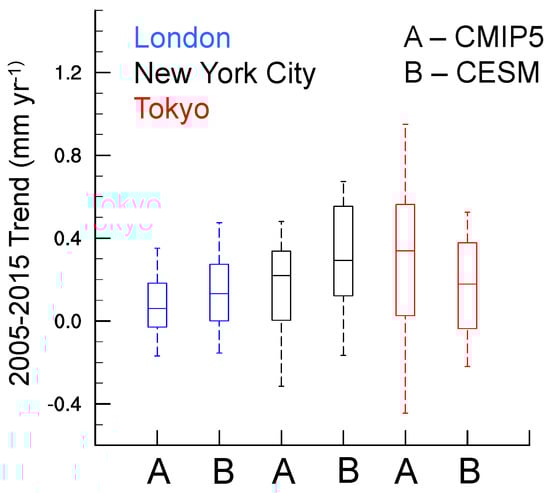 Box plots of steric sea-level trends over the full ocean column for three coastal locations. Notches from top to bottom represent 95% quantile, 75% quantile, median, 25% quantile, 5% quantile. Latitude and Longitudes used to calculate each set are as follows: London: 45–49° N, 346–6° E; Tokyo: 30–40° N, 134–145° E; New York City: 33–46° N, 280–290° E.