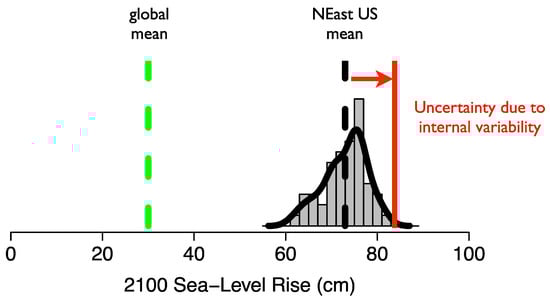 Figure 8 demonstrates how the effect of internal variability may impact the projections of sea-level rise estimates, using the northeastern coast of the United States as a reference. The plot shows different estimates of regional steric plus dynamic sea-level rise in the year 2100 from the CESM ensemble using the ensemble mean global average sea-level change (dashed green line), the ensemble mean sea-level change for the northeastern US (dashed black line), and the upper limit of the ensemble taking into account the model’s internal variability (red line). As seen in Figure 8, accounting for internal variability on a regional scale could increase the projection of the upper bound of sea level rise by an extra 10% for this region. Characterizing uncertainties surrounding internal variability can provide useful information to diagnose potential upper bounds of sea-level rise, taking into account vertical structure of ocean heat uptake and horizontal structure of ocean heat transport. In turn, this information can assist coastal planning and investment decisions [59].
