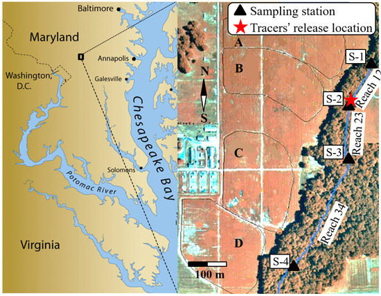 The study site (Figure 1) is located within the Optimizing Production Inputs for Economic and Environmental Enhancement (OPE3) Watershed Research Site of the United States Department of Agriculture (USDA)-Beltsville Agricultural Research Center on the mid-Atlantic coastal plain of Maryland, MD, USA). The entire watershed area is about 70 ha, with 75% employed in agricultural crop production while 15% is under deciduous forest. The site contains a small first-order creek (the Beaver Dam Creek Tributary described in detail by Angier et al., 2005) of ~1100 m length that is instrumented with four stations for monitoring stream flow and water sampling. The creek bed is from 100 to 160 cm wide and the bed slope varies along the creek from 0.0008 to 0.0122 [20] (Cho et al., 2010). The creek runs within a riparian corridor of variable width from about 65 m at its narrowest point, to more than 100 m.