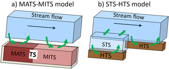 MATS–MITS, adopted from [15] and modified for transient flow conditions, accounts for two compartments in TS, namely, the metabolically active (MATS) and metabolically inactive (MITS) compartments. The main stream water was considered as metabolically inactive. The STS–HTS model (current research) considers the interaction of tracers experiencing advective transport in a stream with STS (dead zones represented by stagnant pools, eddies etc.) and metabolically active stream bed sediments representing hyporheic transient storage (HTS). Stream bed concentration components were considered separately for both the main stream and STS.