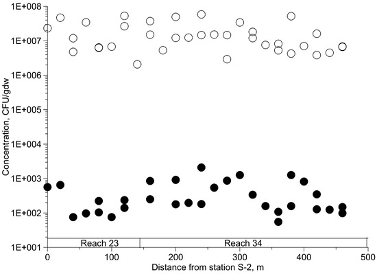The concentrations of E. coli and total heterotroph bacteria in the sediment along the creek are shown in Figure 3. The results illustrate that the E. coli concentrations are a few orders of magnitude smaller than the concentration of total heterotrophs and both can vary substantially within relatively short distances. The average concentration of E. coli in reach 34 was twice of that in reach 23, while the average concentration of total heterotrophs was 1.3 times higher in reach 23 compared with the reach 34. These differences may be related to the differences in association of E. coli with particles of different sizes. Such associations have been shown to be stronger with silt and clay than with sand particles [36,37]. Garzio-Hadzik et al. [38] observed an increase in sediment E. coli concentrations with increasing silt content in the sediment of the creek where our experiments were conducted.