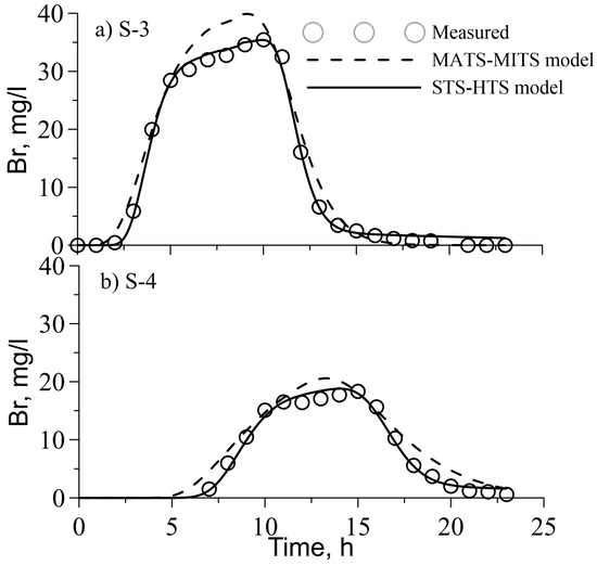 Measured and simulated with two models of BTCs of Br in stations (a) S-3 and (b) S4. Hollow circles represent measured Br concentration, dashed and solid lines represent simulated Br concentration with MATS–MITS and STS–HTS models, respectively.