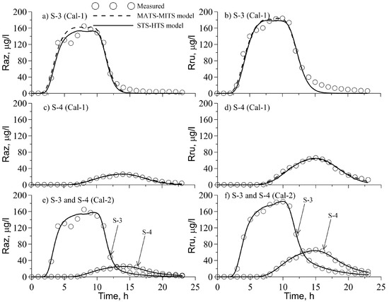 Figure 5 shows the observed and simulated Raz–Rru concentrations at the two creek stations. Simulation results with the MATS–MITS model and the STS–HTS model were quite similar (Figure 5a–d) when the decay and transformation rates in the stream and STS were set to values found in [12]. Both models performed well in fitting the observed BTC Raz and Rru tracers. An exception occurred in the tailing part of the BTC at S-3 approximately 13 h after the experiment started where the simulated concentrations were significantly lower than the observed concentrations. The magnitude of the AICc and standard error (Table 3) evaluation parameters indicated that the MATS–MITS model fit the experimental data slightly better compared to the STS–HTS model. An attempt to calibrate the MATS–MITS model with the parameters of TS ratio (fs) and stream–TS exchange rate () obtained in the Br simulations was not successful and the agreement between the observed and simulated concentrations was much worse when compared to the BTCs presented in Figure 5.