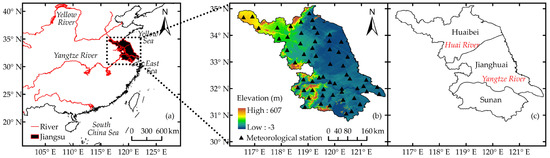 Map showing Jiangsu province: (a) location; (b) meteorological station (▲) and elevation; (c) sub-regions and rivers.