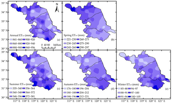 Spatial distribution of seasonal and annual ETref in Jiangsu Province during 1961–2015. Note: (a)–(e) represent ETref in annual, spring, summer, autumn, and winter seasons respectively.