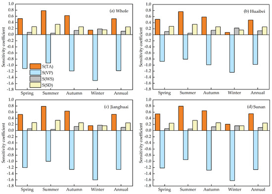 Sensitivities of seasonal and annual ETref in relation to climatic factors in (a) Whole, (b) Huaibei, (c) Jianghuai, and (d) Sunan regions of the Jiangsu province from 1961 to 2015.