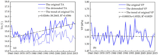 To evaluate the contributions of key meteorological factors to the change trend of ETref quantitatively, the detrending method, a statistical and mathematical operation of removing trend from the series, was employed in this study [8,30,31]. This is a simple but effective method. The main step of this method calculated by simple linear regression is demonstrated as follows: