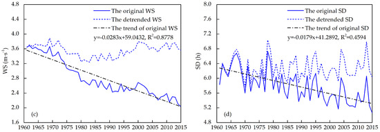 The original and detrended climatic factors (a) TA, (b) VP, (c) WS, and (d) SD for the whole of Jiangsu province during 1961−2015.