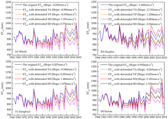 To understand a change event in seasonal and annual ETref due to the contributing factors, it is essential to analyze the contribution of each climatic factor to the change in seasonal and annual ETref. Results in Figure 5 demonstrate that the most important climatic factor dominating the trends in annual ETref on the whole Jiangsu province followed the order WS > SD > TA > VP. In general, the ETref recalculated with detrended TA and detrended VP was smaller than that calculated from the original climatic factors. On the contrary, the ETref recalculated with detrended WS and detrended SD was larger than that calculated from the original climatic factors. In other words, TA and VP had positive contributions to ETref, except VP in the Huaibei region, which exhibited a negative contribution, while WS and SD showed the opposite ones. In the end, the negative contributions would offset the positive one.