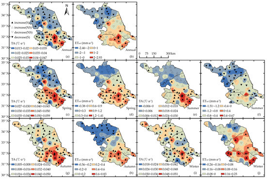 Spatial distributions of climate tendency rates of the TA and ETref from 1961 to 2015 in Jiangsu province. Note: S and NS represent significant and non-significant trends at the 0.05 level of the TA and ETref, respectively. (a), (c), (e), (g), and (i) represent the trends of TA in annual, spring, summer, autumn, and winter seasons, respectively, (b), (d), (f), (h), and (j) represent the trends of ETref in annual, spring, summer, autumn and winter seasons, respectively.