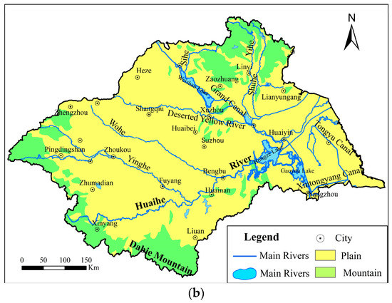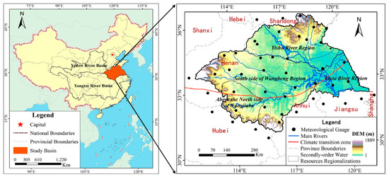 The study area is the whole Huaihe River basin, which lies approximately between 30°57′ N–36° N and 112° E–121° E in eastern China (see Figure 1). It lies in the region from the Yangtze River basin in the south to the Yellow River basin in the north. The total geographical area of the basin is approximately 259,700 km2. The whole basin is divided into the Huaihe River catchment and the Yishusi River catchment by the paleo-channel of the Yellow River and is composed of four secondly-order water resource regionalizations. Its landscape is characterized by the near level plain and hill, among which the plain occupies more than 80% of the total basin area. The spatio-temporal distribution of annual precipitation is uneven in the basin. The mean annual precipitation in the Huaihe River basin during 1961 to 2011 is 884 mm. While the average annual maximum precipitation is 2.5 times bigger than the minimum for the period of 1961 to 2011, and the precipitation amount notably decreases from southeast to northwest. Mean annual temperature is approximately 14.47 °C, and average maximum temperature goes up to 15.79 °C, whereas the minimum temperature drops to 7.38 °C for period from 1961 to 2011. With the dramatic effects of the global climate changes and human activities, underlying surfaces and water resources changes of the Huaihe River basin have attracted more and more attention. In addition to its special geographical conditions from sub-tropical zone to warm temperate zone and from wet zone to semi-arid and arid zone and complex the climate factors, the Huaihe River basin is characterized by frequent or continuous drought or flood events, floods in the south region, and droughts in the north, and drought-flood shifting [28,29,30].