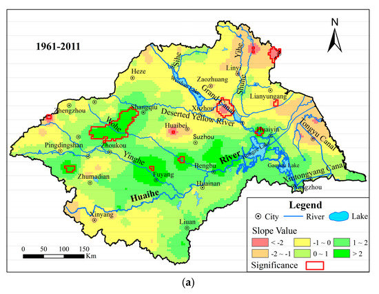 where slope represents the estimated linear trend of precipitation during the period of 1961 to 2011. Positive values of the slope indicate increasing trends, while negative values of the slope denote decreasing trends [13]; i is the number of years in the time series (this study is from 1 to 51); and Pi is the annual precipitation amount. We used the MK test to detect whether a trend in the rainfall time series is statistically significant at a 95% confidence level [14].