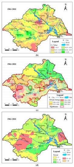 Based on the Cv test, Figure 3b indicates annual precipitation had the different spatial variations between 1961 and 2011 in the Huaihe River basin. The randomicity was greater in the part of the west and north regions than in the middle and southwest. The overall range of Cvs changed between 0.18 and 0.31 and the randomicity of annual rainfall was determined as the moderate variability. The Cvs, ranging between 0.22 and 0.26, were detected at the rate of 89% and distributed nearly in the whole area; the Cvs greater than 0.26 were primarily around Zhumadian and Fuyang, which accounted for about 5% of the total area analyzed. The Cvs were less than 0.22, and its proportion of the region area was approximately 5% in the vicinity of Xuzhou, the southwest of Liuan, and the southeast corner. The Cvs were less than 0.2 in the rest of the area. The annual rainfall uneven distribution was obvious in the north, upstream of the Huaihe River and downstream of the Yihe and Sihe Rivers. The geomorphology of these regions was mainly the plain (Figure 2b). In contrast, the inhomogeneous changes of the annual precipitation were slight in the mountain regions. These implicated that the annual precipitation distribution was more heterogeneous in mountain areas than in the plain.