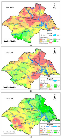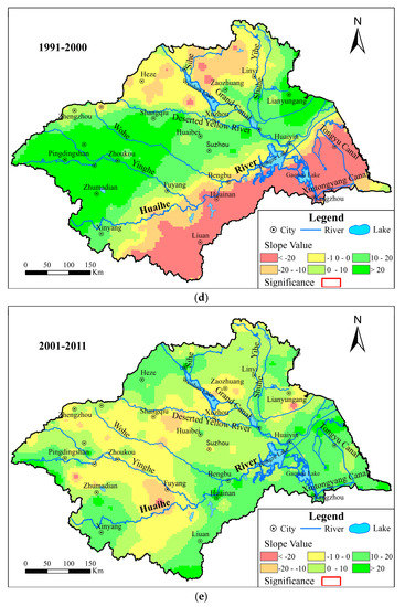 There were five 10-year periods, including the 1960s, 1970s, 1980s, 1990s, and beginning of the 21st century. The inter-decadal precipitation showed a slightly increasing trend during the various periods (from the 1960s to the beginning of the 21st century). The mean magnitude of the trend was successively about −12, −10, 3, 3, and 6 mm/year during the various periods. The magnitude changes were different in the basin’s various orientations (Figure 4). The negative trends were detected in the north of the downstream of Huaihe River and the positive ones were in the south of the upstream of Huaihe River in the 1960s (Figure 4a), where the magnitude ranged from −58 to 41 mm/year. Additionally, the rainfall trends decreased sharply in parts of the northeastern basin and increased slightly in the western basin during the 1970s (Figure 4b). The tendency magnitude was between −57 and 23 mm/year. Furthermore, the tendency magnitude range was from −43 to 42 mm/year in the 1980s (Figure 4c). The majority of the northeastern basin showed an increasing trend while a decrease occurred in the parts of the southwestern basin. Conversely, the precipitation magnitude increased in most parts of the northwestern basin and decreased in the southeast of the Huaihe River in the 1990s (Figure 4d). The magnitude ranged from −48 to 57 mm/year. Finally, the rainfall magnitude changed from −28 to 38 mm/year during the beginning of the 21st century (Figure 4e). The precipitation decreased in the parts of the central and western basin and increased in most areas. It was remarkable that all trend changes had no distinguishability by the significance test.