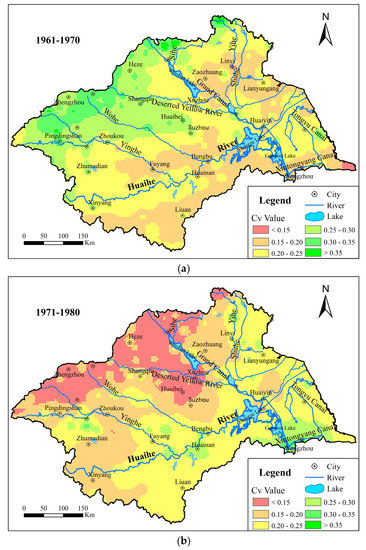 The mean Cvs were heterogeneous and changed from 0.20 to 0.27. The precipitation randomicity increased during the 1960s and 1970s, and then decreased in the 1980s, and increased again between 1990s and the beginning of the 21st century. The Cv was 0.23 in the 1960s, which indicated that precipitation was relatively even across most of the basin. The values reached 0.27, 0.20, 0.23, and 0.23 in the 1970s, 1980s, 1990s, and early 21st century, respectively. Most of the uneven precipitation occurred in the north of the Huaihe River and changed with climate change.