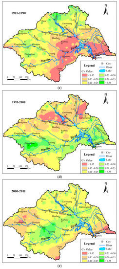 The decadal precipitation heterogeneity was investigated by using the Cvs (Figure 5). We demonstrated that there were notable changes between the minimum and maximum Cv. The Cv vaule ranged variously (from 0.07 to 0.41) in different decades. The difference between the minimum and maximum Cv was 0.34. However, the randomicity was also the moderate variability. It ranged between 0.14 and 0.41 in 1960s (Figure 5a). The uneven precipitation was geographically concentrated in the northern edges of the basin, where the Cv value was greater than 0.25. The minimum Cv value was 0.07 and the maximum was 0.33 in the 1970s (Figure 5b). The precipitation was relatively even across the most areas of the basin during this period. The Cv ranged from 0.10 to 0.37 during the 1980s period (Figure 5c). The precipitation variability was obvious in the downstream of the Yinghe River, Yihe River and Sihe River. The Cv value ranged from 0.11 to 0.41 during the 1990s (Figure 5d) and 0.11 to 0.38 at the beginning of the 21st century (Figure 5e). The precipitation was uneven in the Yinghe River basin and the south parts of the middle and lower reaches of the Huaihe River in 1990s. The dissimilar precipitation was chiefly concentrated in the north parts of the Huaihe River at beginning of the 21st century.