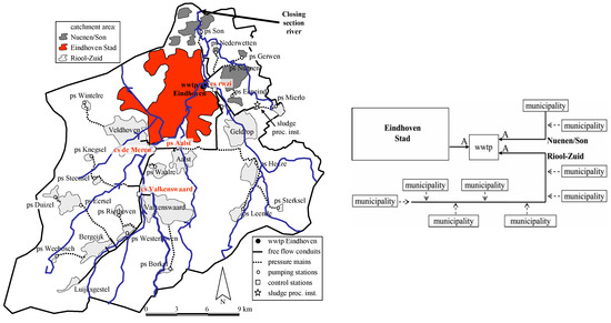 Figure 1. Wastewater system of Eindhoven (Left) and its receiving streams and schematic lay out of the wastewater system; (Right) Figure reproduced with permission from [23].
