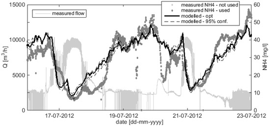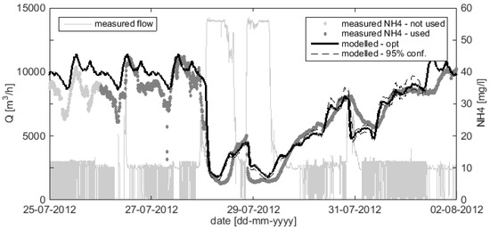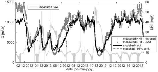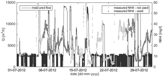 A final application of the influent model discussed in this paper is gap filling in time series [39]. Figure 15 shows an example of the application of gap filling. The dots show the measured NH4 concentration in the influent of WWTP Eindhoven. The dark grey dots are data that could be used e.g., for assessing the performance of the influent model, the light grey dots show data that are rejected during the validation. The black line shows the simulated concentrations by the influent model. By applying gap filling a continuous time series is generated, the final time series is composed of the dark grey dots and where these are missing data are filled in using the influent model results.