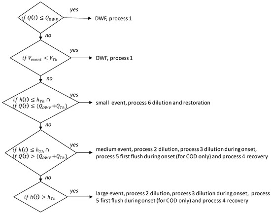 Figure 4. Selection of water quality processes to be superimposed on process 1 during dry weather (DWF), using information on hydraulics. The abbreviation Th in the figure is short for threshold.