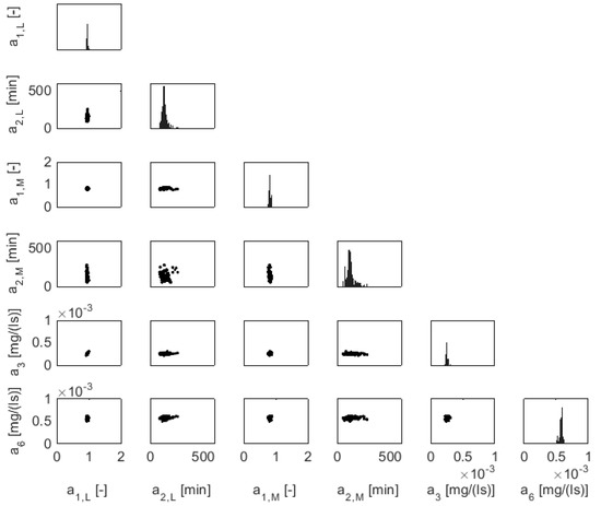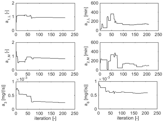 The DREAM algorithm was applied with a total of 5000 iterations for the COD model and 2500 for the NH4 model. The algorithm uses 2 × n Markov Chains, with n being the number of model parameters being evaluated. This resulted in 312 iterations for the COD model and 208 iterations for the NH4 model. Figure 6 shows the variation in model parameter values during the calibration process for the model for NH4 for catchment Eindhoven Stad for the first Markov Chain of each iteration. Parameters concerning medium and large storm events are denoted in Figure 6 as subscripts M and L respectively. The value of each of the model parameters is relatively stable during the calibration process, showing that the number of iterations was sufficient to converge.