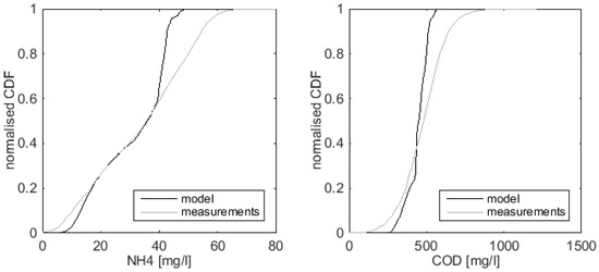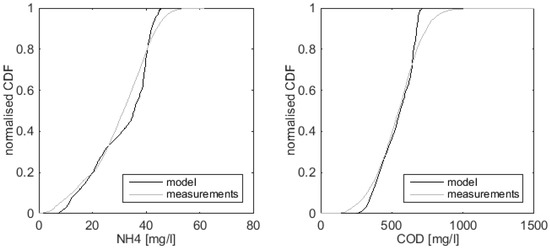 Figure 9. CDFs of model results and measurements for NH4 and COD in WWTP influent for the Eindhoven Stad (ES) catchment.