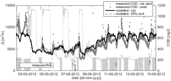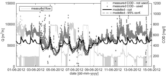 The base line of the model consists of the mean DWF concentration. Data analysis of available 24 h composite samples of the WWTP influent showed that there was no seasonal trend for NH4 and COD. Despite the absence of a seasonal trend, the mean DWF concentration varied during the monitoring period. Due to a lack of sampling data, it could not be determined whether changes in this DWF concentration level were due to real changes or due to e.g., a temporary drift of the sensor. Differences in the main DWF concentration levels were observed for NH4, e.g., compare the concentration levels on 16 July in Figure 12 (around 40 mg/L) and 1 December in Figure 13 (around 55 mg/L). This difference is even bigger for COD, see Figure 14. The mean DWF, derived from monitoring data, is nearly 500 mg COD/L, while the monitoring data on 2 June are nearly 700 mg COD/L. In this study, the model has been calibrated using the mean DWF derived from all available monitoring data during DWF.