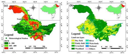 (a) Geographical locations and (b) land use types of the meteorological stations used in this study for Heilongjiang Province, northeast China.